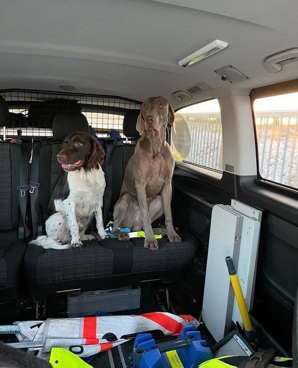 Die Bundespolizisten staunten nicht schlecht, als neben Personen und Fahrzeugen auch zwei Hunde vor ihnen standen. Bevor die Streuner auf die viel befahrene Autobahn laufen konnten, wurden sie von den Beamten in “Schutzgewahrsam” genommen und auf die Rückbank im Streifenwagen gesetzt — was den “Flüchtigen” sichtlich gut gefiel.